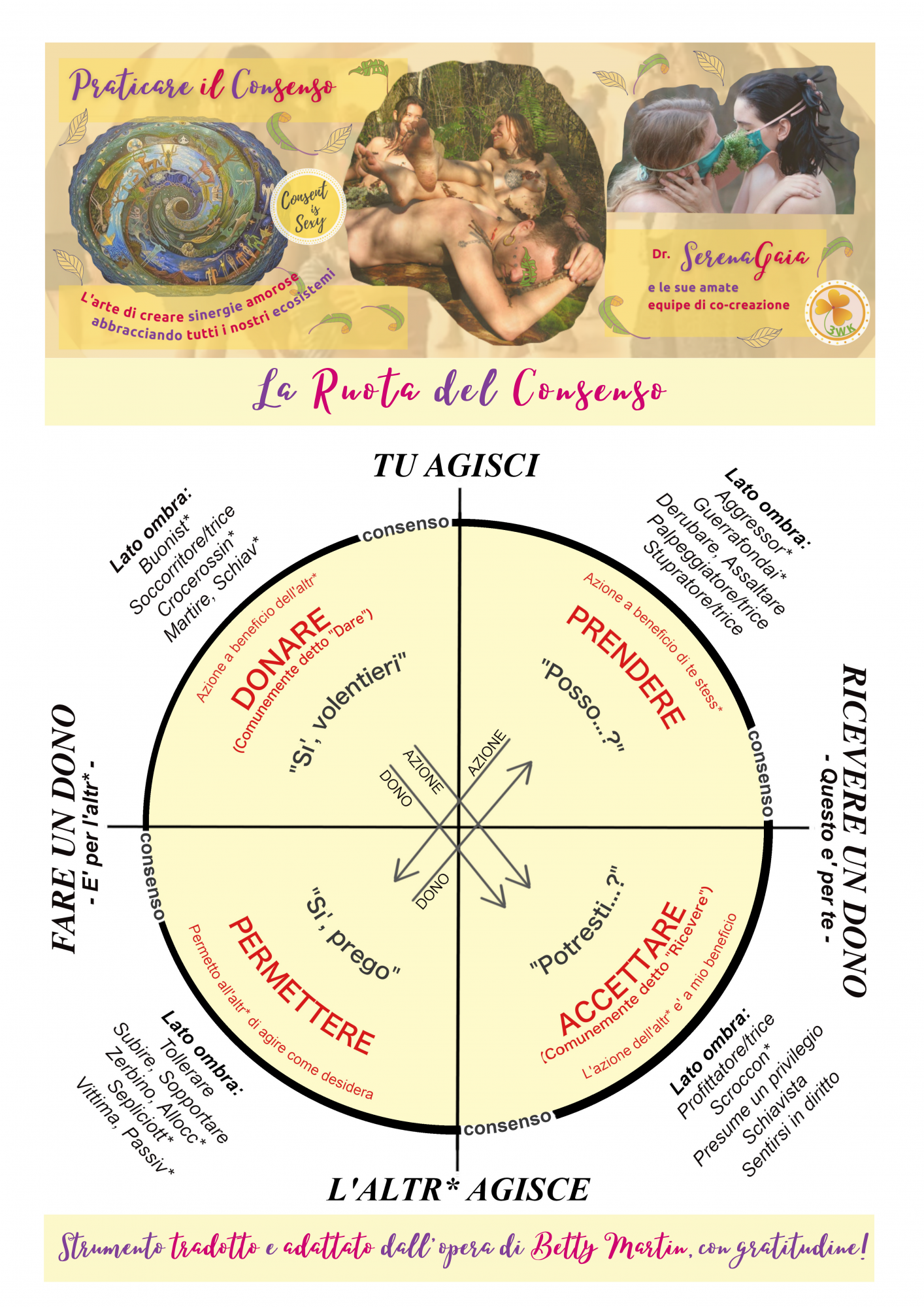 Il workshop proposto si avvale dell’adattamento e traduzione in italiano della RUOTA DEL CONSENSO, strumento approntato dalla educatrice “sex-positive” Dr. Betty Martin.
